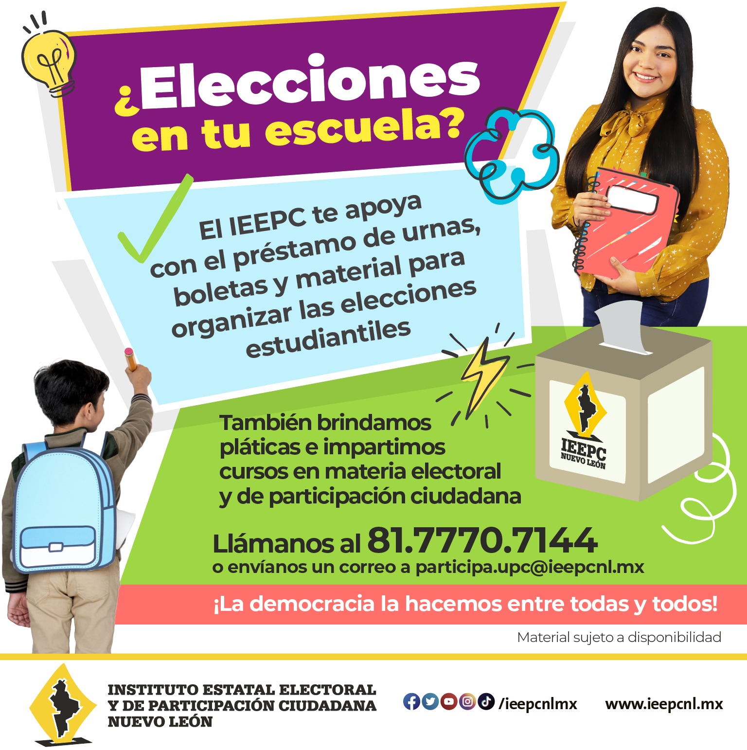 Servicios en materia electoral como pláticas, cursos, apoyo en elecciones estudiantiles y préstamo de material electoral, entre otros, a las instituciones públicas y privadas que lo soliciten, con el objetivo promover la formación ciudadana y de otorgarles herramientas para que conozcan o refuercen los aspectos básicos de un proceso electoral y de la cultura democrática.